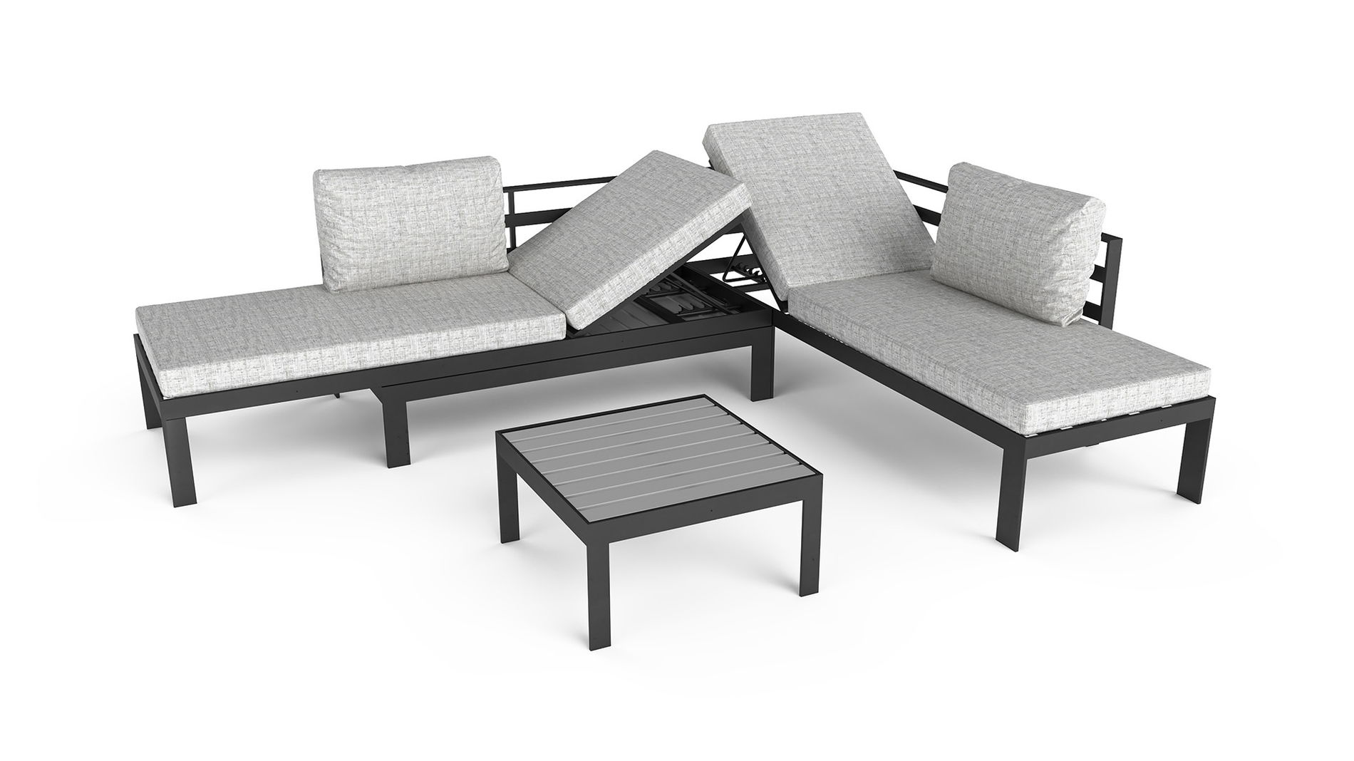 I telai del set modulare sono in alluminio color antracite. Gli spessi cuscini in grigio screziato offrono il massimo comfort e si armonizzano perfettamente con la struttura grigio scuro e i piani del tavolo grigio chiaro. Unendo i due lettini, il set si trasforma in un comodo e ampio daybed. I lettini possono essere fissati in posizione grazie a un meccanismo di bloccaggio. Nessuno vorrebbe fare a meno di un set modulare come questo. Portate questo lusso confortevole nella vostra area esterna.