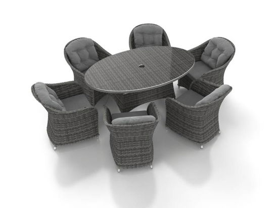 Un tavolo ovale di 150 x 90 x 75 cm, e sei sedie. Il set Livia L è l’ideale per sfruttare al massimo della bella stagione. Il rattan sintetico grigio utilizzato per questo set gli dona un look incredibile e ne risalta la morbidezza del disegno. Le comode poltroncine con braccioli avvolgenti fanno di Livia L il tavolo ideale per trascorrere momenti felici in famiglia o con gli amici, sfruttando al massimo il tuo giardino o terrazza in buona compagnia. Il set da pranzo Livia L è disponibile anche in una versione più grande. Con tavolo di 220 x 120 x 75cm.