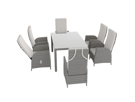 L'elegante set da pranzo Ceres Relax M della collezione Classics offre spazio per sei persone. È composto da un tavolo rettangolare con piano in vetro trasparente e da sei poltrone, ognuna delle quali ha lo schienale regolabile. L'angolo dello schienale è regolato da chiusure nella zona laterale della poltrona. Questo nobile gruppo in rattan è fatto per un pasto intimo sotto il cielo aperto - un luogo che dona comfort.