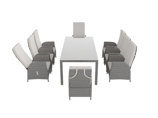 Fate sorridere i vostri ospiti. Il lussuoso set da pranzo Ceres Relax XL della collezione Classics offre spazio per una famiglia numerosa o per gli amici. Oltre a un tavolo rettangolare con un elegante piano in vetro, offre anche otto poltrone, ognuna delle quali ha uno schienale regolabile. Quest'ultimo può essere regolato individualmente grazie a una chiusura nella zona laterale del bracciolo e adattato alle esigenze dell'utente. Altrettanto confortevoli dell'inclinazione sono i cuscini chiari che ricoprono sia la seduta che lo schienale regolabile.