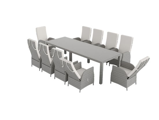 Tutto è perfetto con questo gruppo di tavoli della collezione Classics. Il telaio è realizzato in robusto alluminio, mentre l'esterno è caratterizzato da un intreccio decorativo di rattan grigio screziato. Anche i cuscini chiari che ricoprono la seduta e lo schienale regolabile sono in tinta. Non lasciatevi sfuggire questo lusso e arricchite il vostro spazio esterno con questo comodo gruppo di tavoli per una grande compagnia. ARTELIA offre anche il set da pranzo Ceres Relax nelle misure S, M, L e XL.