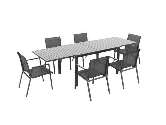 Sia il tavolo estraibile di facile manutenzione con due ripiani che le comode sedie hanno strutture in robusto alluminio . Il rivestimento delle sedute è realizzato in resistente textilene e anche in antracite. Il materiale moderno è antistrappo, resistente alle intemperie e permeabile all'aria , così puoi stare comodamente seduto al fresco anche ad alte temperature. Non sono necessari ulteriori supporti per sedie. Concediti il lusso di possederlo nella tua area esterna e goditi l'estate a cielo aperto.