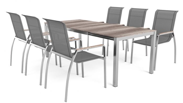 Eleganza e classe: il set da pranzo Sorrento L combina acciaio inossidabile di alta qualità con un confortevole textilene oltre che uno stile realistico in teak. Il set è composto da un tavolo allungabile e sei sedie con braccioli. Mentre i telai sono realizzati in acciaio inossidabile, i sedili e gli schienali delle sedie sono presentati con un moderno tessuto grigio in textilene, i braccioli sono rivestiti in parquet di teak. Il tessuto è resistente agli agenti atmosferici, resistente agli strappi, elastico e anche permeabile all'aria, in modo da poter rimanere fresco anche a temperature elevate - una seduta confortevole per la quale non è necessario alcun ulteriore strato. Attribuiamo grande importanza alla qualità e, per questo motivo, processiamo solo materiali di alta qualità e esclusivi. Ciò vale sia per il tessuto dei cuscini sia per l'alluminio.
