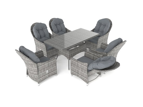 Un tavolo rettangolare, una combinazione chic di sei sedie con schienale regolabile, più comunemente chiamate poltrone: Questo è il modo migliore per godere anche dopo i pasti o durante i momenti di relax la compagnia dei vostri ospiti.