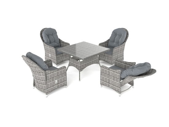 Il modello Velia Relax M vi offre l'eleganza di quattro comode poltrone con schienale regolabile e un tavolo di 100 x 100 x 75 centimetri. Una bevanda fresca, un gelato e un bel giro di conversazione con amici o partner d'affari. Nel vostro giardino di casa, vi piacerà sicuramente sedervi da soli per leggere o sfogliare dei documenti. È molto più divertente lavorare all'aperto e in posti comodi. Se sei un imprenditore e stai pensando a come arredare in modo più elegante il tuo caffè o la zona benessere del tuo hotel, Velia Relax M è una possibile soluzione. Con esso, sarete sicuri di deliziare i vostri clienti, perché la piacevole atmosfera irradiata dai toni morbidi del colore e l'aspetto invitante dei suoi contorni curvi vi lasceranno entusiasti. Il polyrattan affronta in modo eccellente le condizioni ambientali. I cuscini dei sedili vengono conservati al chiuso durante la notte, i mobili in rattan resistono ai raggi UV, ad un acquazzone o alla rugiada mattutina. Si adattano anche alle fluttuazioni di temperatura. La loro anima interna è composta da una stabile cornice di alluminio. La serie Velia è disponibile anche con un tavolo L e XL. Se avete domande, non esitate a contattarci!