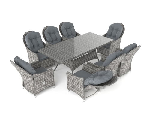 Un tavolo rettangolare, una combinazione chic di sei sedie con schienale regolabile, più comunemente chiamate poltrone: Questo è il modo migliore per godere anche dopo i pasti o durante i momenti di relax la compagnia dei vostri ospiti.